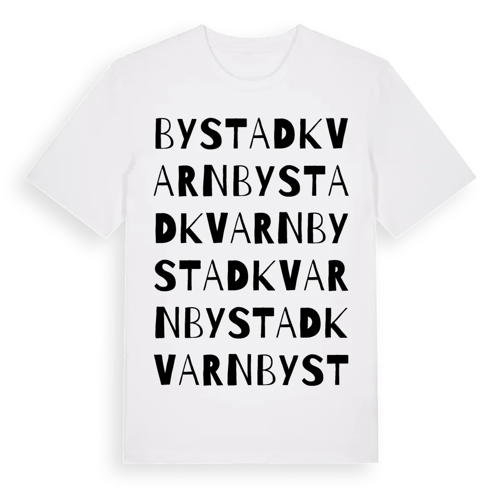 Bystadkvarn ordlek t-shirt är inspirerad av Bystadkvarn i Örebro län, Sverige. Tröjan är designad för dig som har en speciell koppling till platsen – oavsett om du bor här, har rötterna här eller bara älskar Bystadkvarn.
