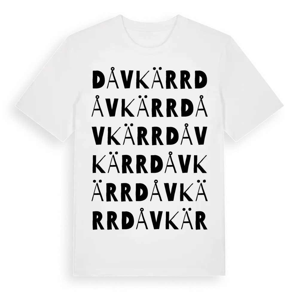 Dåvkärr ordlek t-shirt är inspirerad av Dåvkärr i Örebro län, Sverige. Tröjan är designad för dig som har en speciell koppling till platsen – oavsett om du bor här, har rötterna här eller bara älskar Dåvkärr.