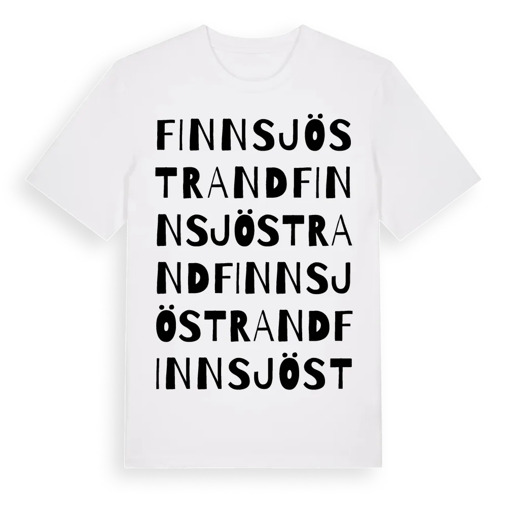 Finnsjöstrand ordlek t-shirt är inspirerad av Finnsjöstrand i Örebro län, Sverige. Tröjan är designad för dig som har en speciell koppling till platsen – oavsett om du bor här, har rötterna här eller bara älskar Finnsjöstrand.
