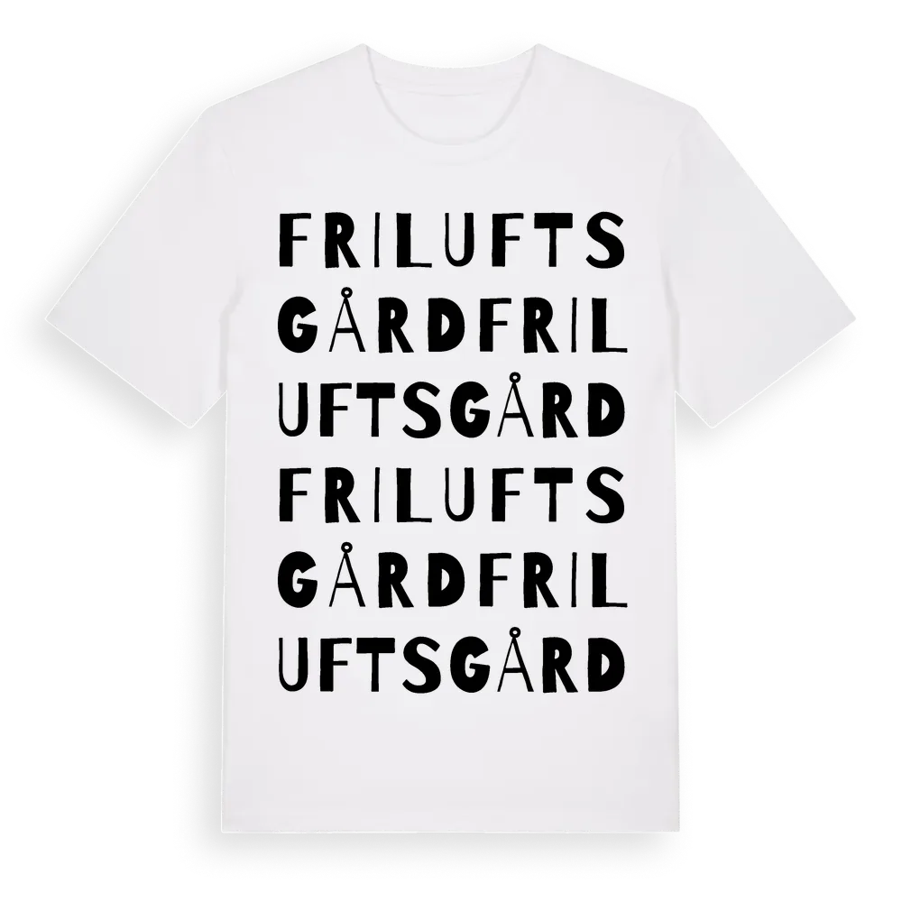 Friluftsgård ordlek t-shirt är inspirerad av Friluftsgård i Örebro län, Sverige. Tröjan är designad för dig som har en speciell koppling till platsen – oavsett om du bor här, har rötterna här eller bara älskar Friluftsgård.