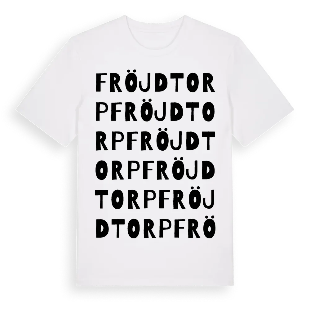 Fröjdtorp ordlek t-shirt är inspirerad av Fröjdtorp i Örebro län, Sverige. Tröjan är designad för dig som har en speciell koppling till platsen – oavsett om du bor här, har rötterna här eller bara älskar Fröjdtorp.
