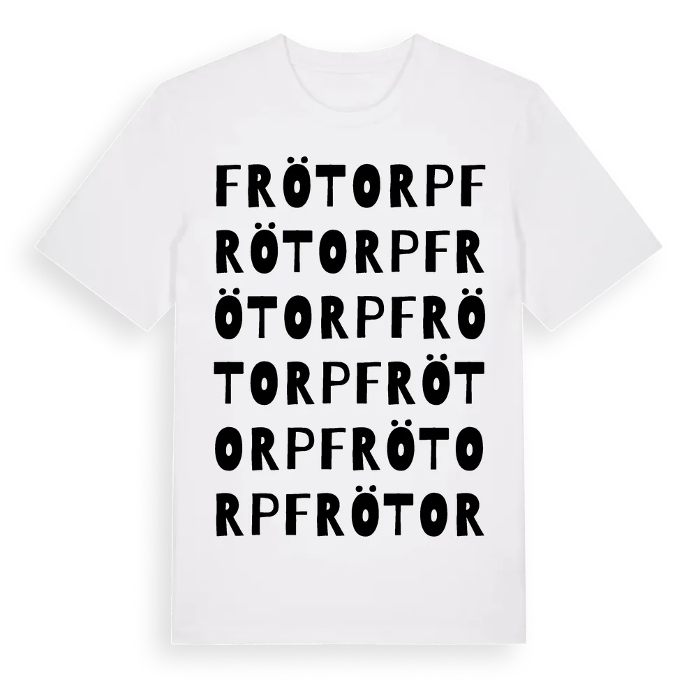 Frötorp ordlek t-shirt är inspirerad av Frötorp i Örebro län, Sverige. Tröjan är designad för dig som har en speciell koppling till platsen – oavsett om du bor här, har rötterna här eller bara älskar Frötorp.