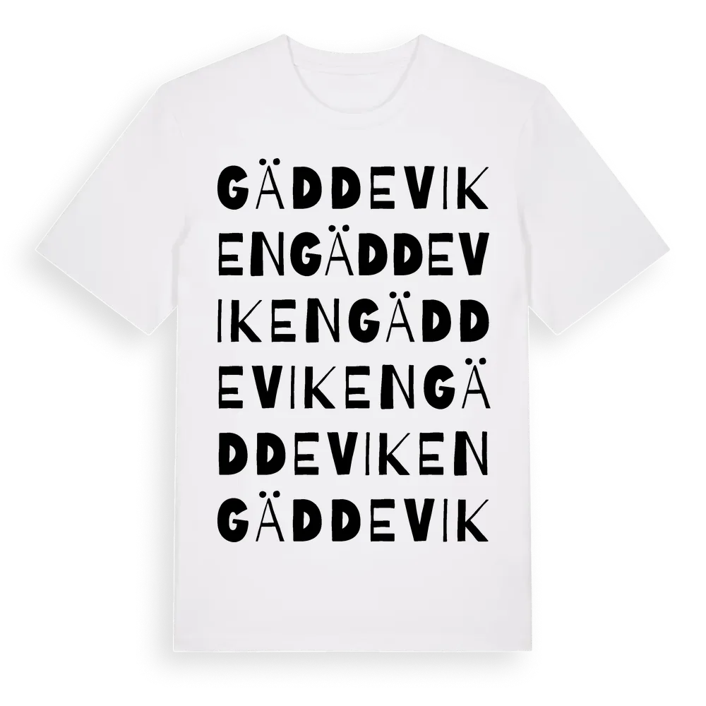 Gäddeviken ordlek t-shirt är inspirerad av Gäddeviken i Örebro län, Sverige. Tröjan är designad för dig som har en speciell koppling till platsen – oavsett om du bor här, har rötterna här eller bara älskar Gäddeviken.