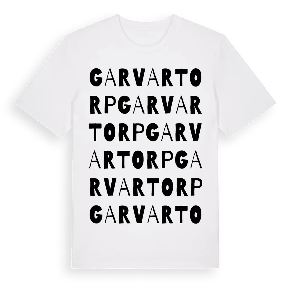 Garvartorp ordlek t-shirt är inspirerad av byn Garvartorp i Örebro län, Sverige. Tröjan är designad för dig som har en speciell koppling till platsen – oavsett om du bor här, har rötterna här eller bara älskar Garvartorp.