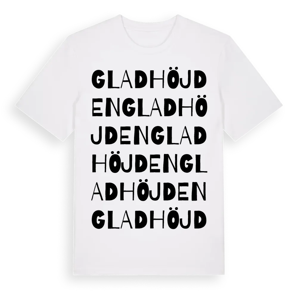 Gladhöjden ordlek t-shirt är inspirerad av Gladhöjden i Örebro län, Sverige. Tröjan är designad för dig som har en speciell koppling till platsen – oavsett om du bor här, har rötterna här eller bara älskar Gladhöjden.