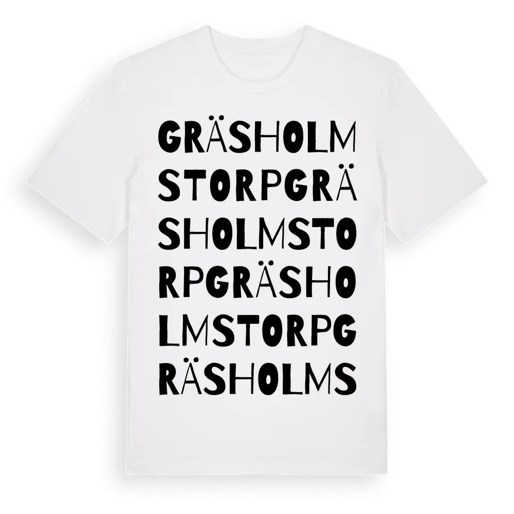 Gräsholmstorp ordlek t-shirt är inspirerad av Gräsholmstorp i Örebro län, Sverige. Tröjan är designad för dig som har en speciell koppling till platsen – oavsett om du bor här, har rötterna här eller bara älskar Gräsholmstorp.