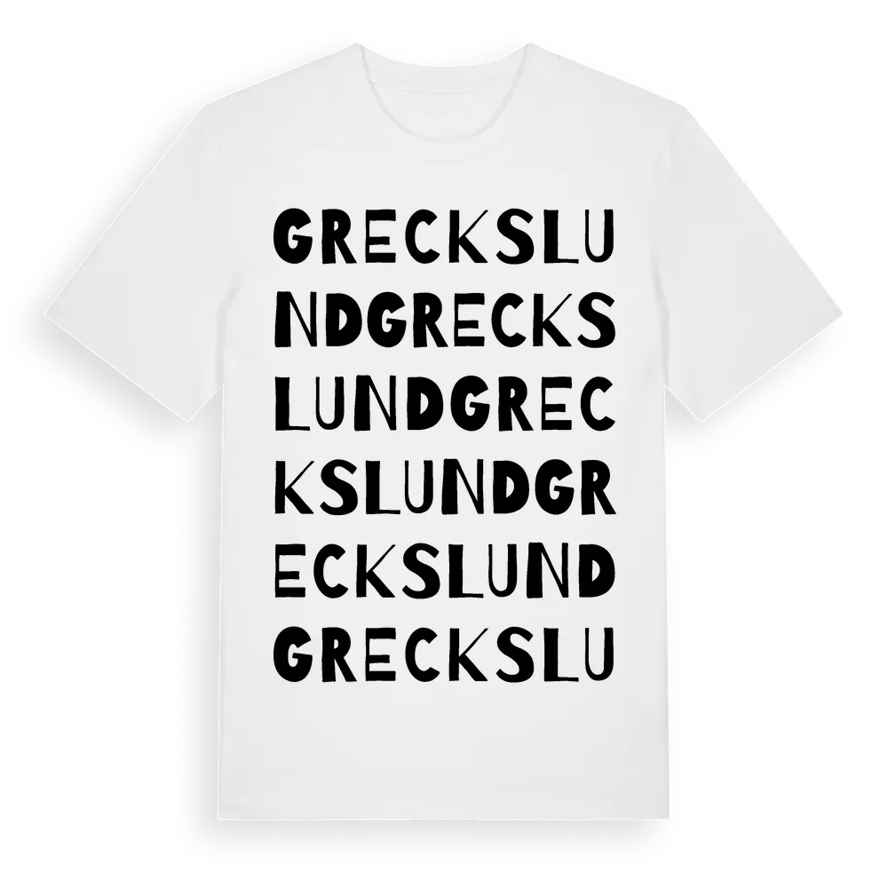 Greckslund ordlek t-shirt är inspirerad av Greckslund i Örebro län, Sverige. Tröjan är designad för dig som har en speciell koppling till platsen – oavsett om du bor här, har rötterna här eller bara älskar Greckslund.