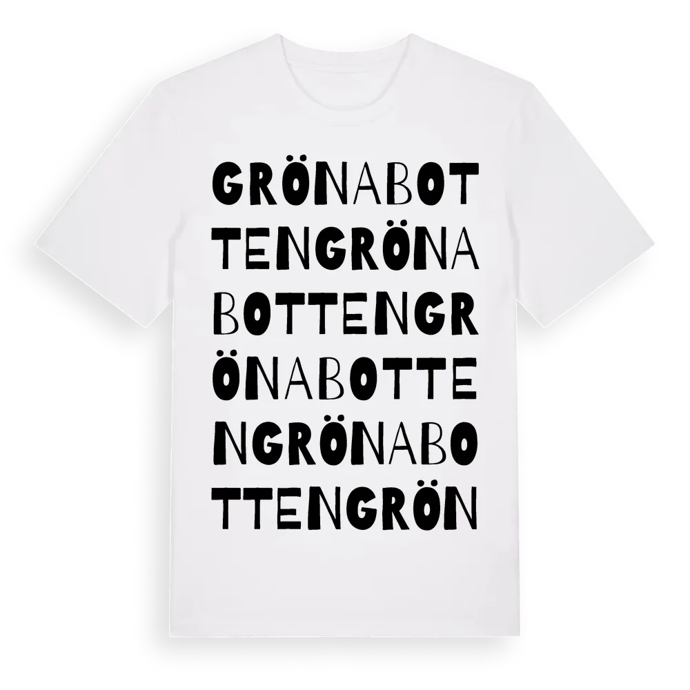 Gröna Botten ordlek t-shirt är inspirerad av Gröna Botten i Örebro län, Sverige. Tröjan är designad för dig som har en speciell koppling till platsen – oavsett om du bor här, har rötterna här eller bara älskar Gröna Botten.