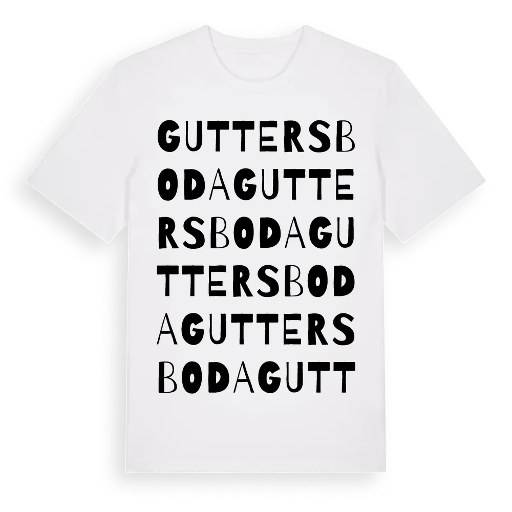 Guttersboda ordlek t-shirt är inspirerad av byn Guttersboda i Örebro län, Sverige. Tröjan är designad för dig som har en speciell koppling till platsen – oavsett om du bor här, har rötterna här eller bara älskar Guttersboda.