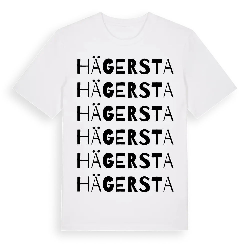 En ordlek byggd på Hägerstas namn. Subtilt och klurig – ett motiv som bara de som verkligen känner platsen fullt ut förstår. Premium bomull, unisex – från Hägersta i Örebro län.