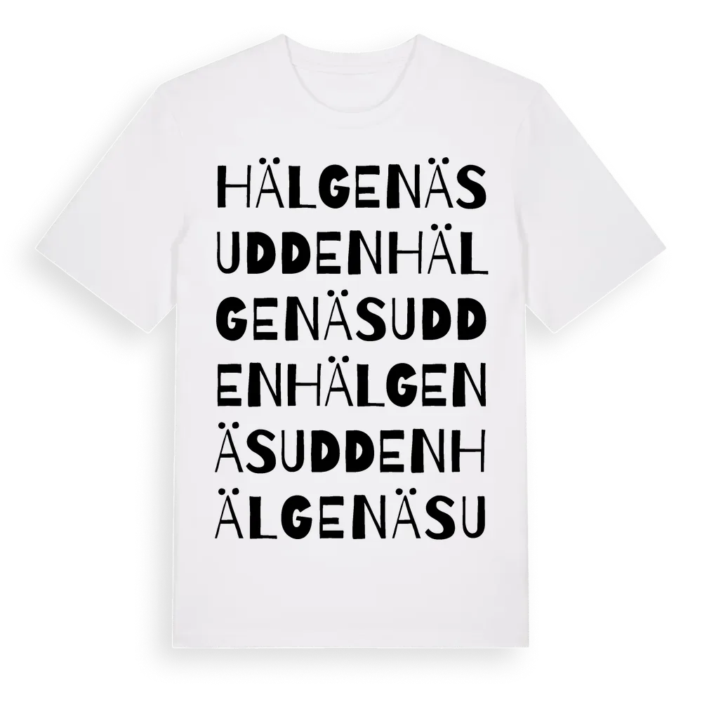 Hälgenäsudden ordlek t-shirt är inspirerad av Hälgenäsudden i Örebro län, Sverige. Tröjan är designad för dig som har en speciell koppling till platsen – oavsett om du bor här, har rötterna här eller bara älskar Hälgenäsudden.