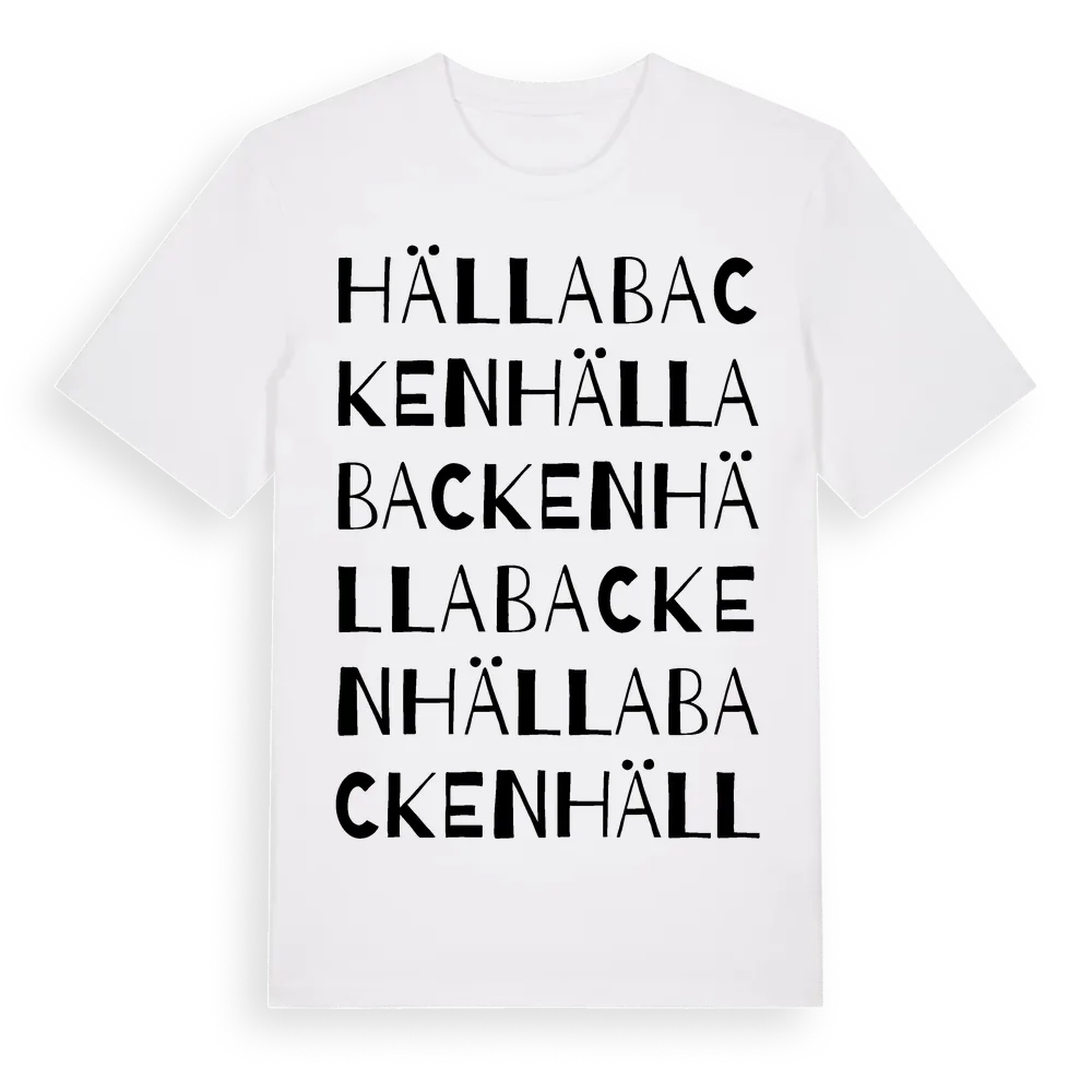Hällabacken ordlek t-shirt är inspirerad av byn Hällabacken i Örebro län, Sverige. Tröjan är designad för dig som har en speciell koppling till platsen – oavsett om du bor här, har rötterna här eller bara älskar Hällabacken.
