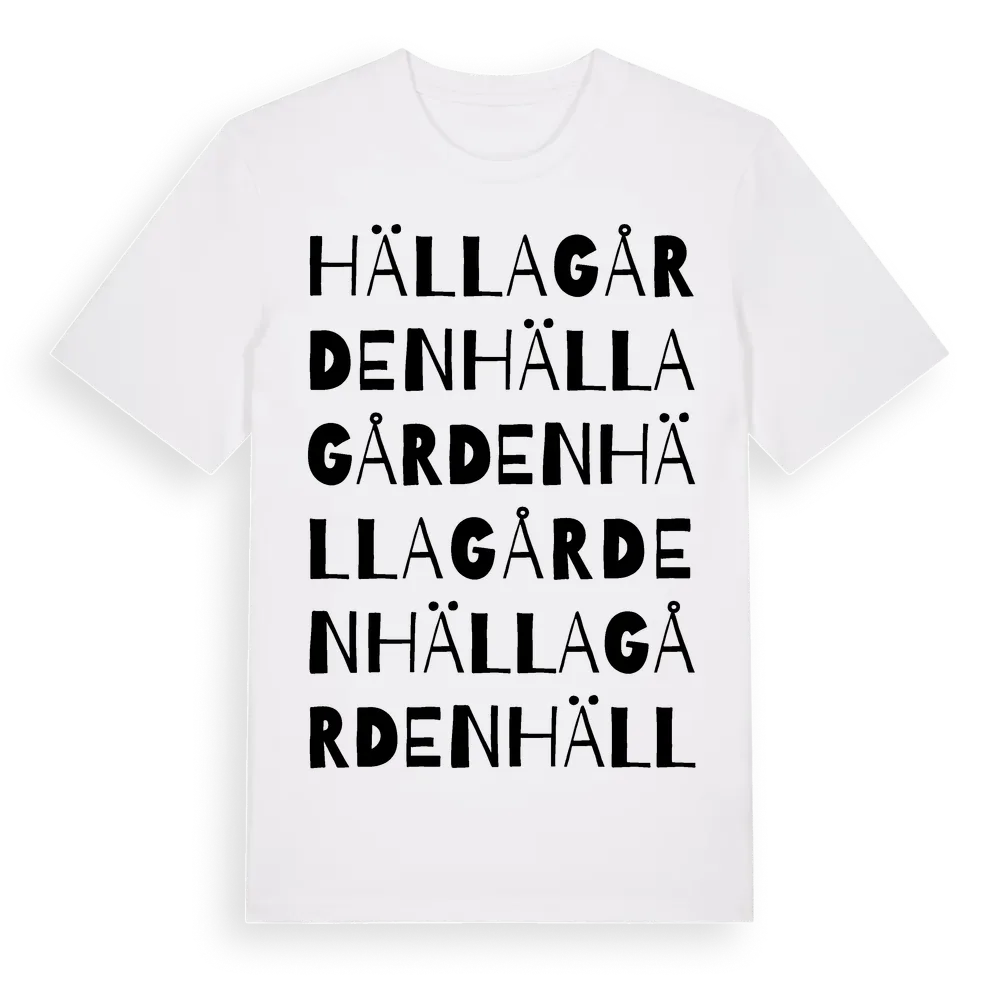 Hällagården ordlek t-shirt är inspirerad av Hällagården i Örebro län, Sverige. Tröjan är designad för dig som har en speciell koppling till platsen – oavsett om du bor här, har rötterna här eller bara älskar Hällagården.