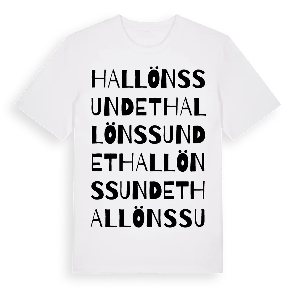 Hallönssundet ordlek t-shirt är inspirerad av Hallönssundet i Örebro län, Sverige. Tröjan är designad för dig som har en speciell koppling till platsen – oavsett om du bor här, har rötterna här eller bara älskar Hallönssundet.