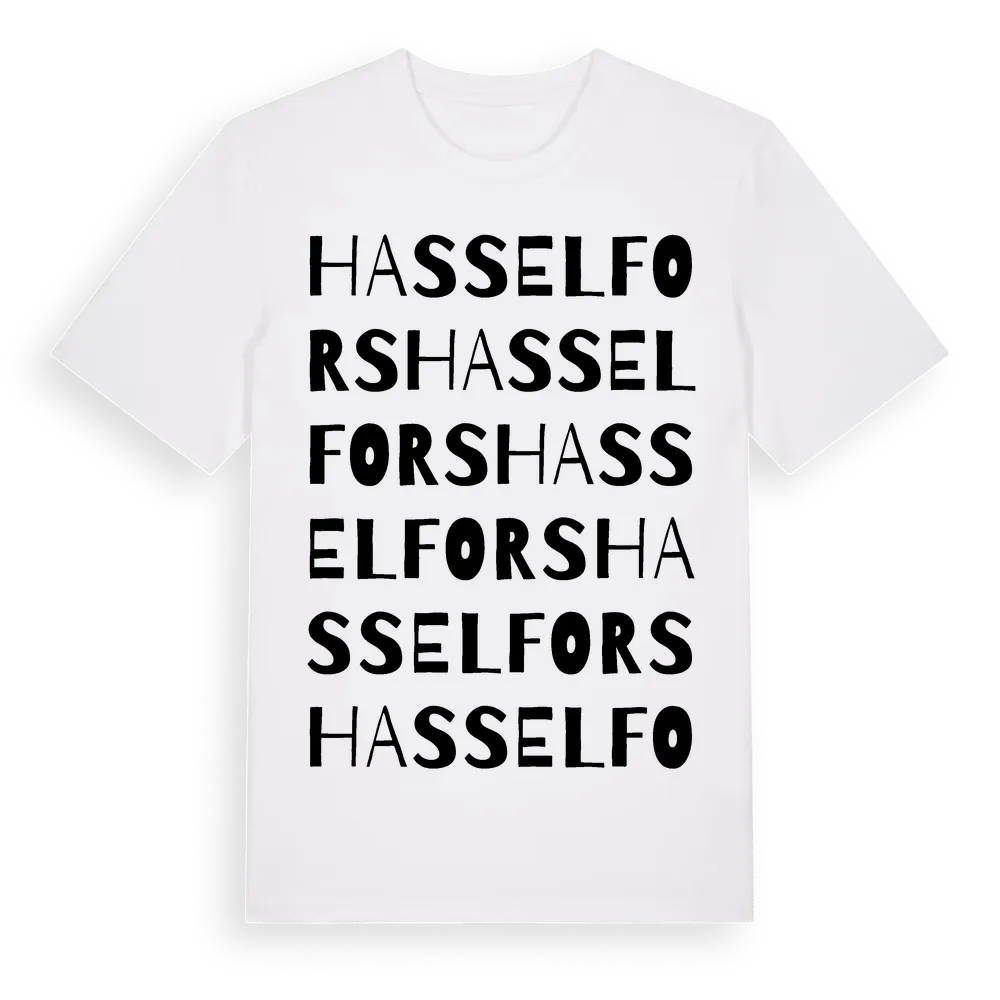 Hasselfors ordlek t-shirt är inspirerad av byn Hasselfors i Örebro län, Sverige. Tröjan är designad för dig som har en speciell koppling till platsen – oavsett om du bor här, har rötterna här eller bara älskar Hasselfors.