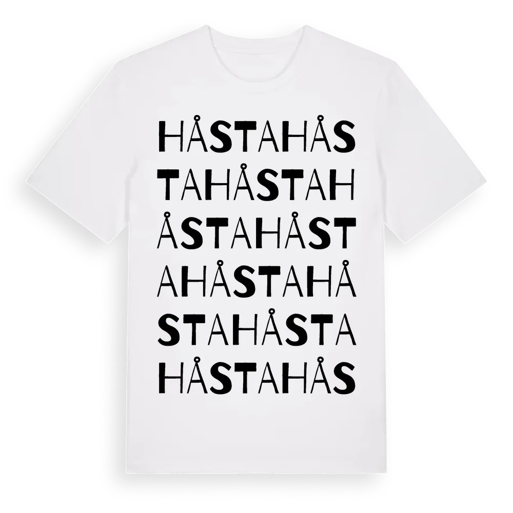 Håsta ordlek t-shirt är inspirerad av Håsta i Örebro län, Sverige. Tröjan är designad för dig som har en speciell koppling till platsen – oavsett om du bor här, har rötterna här eller bara älskar Håsta.