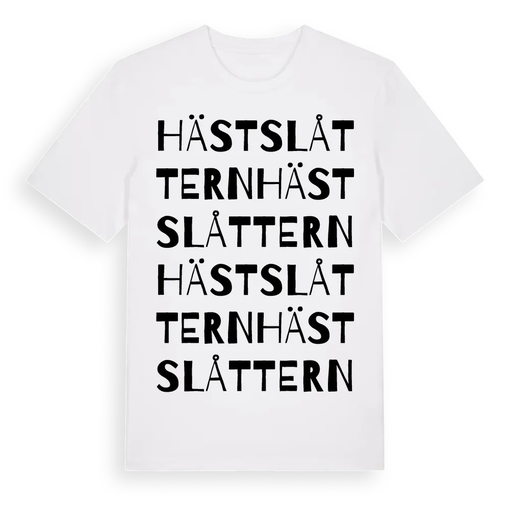 Hästslåttern ordlek t-shirt är inspirerad av Hästslåttern i Örebro län, Sverige. Tröjan är designad för dig som har en speciell koppling till platsen – oavsett om du bor här, har rötterna här eller bara älskar Hästslåttern.
