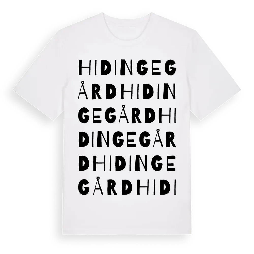 Hidingegård ordlek t-shirt är inspirerad av byn Hidingegård i Örebro län, Sverige. Tröjan är designad för dig som har en speciell koppling till platsen – oavsett om du bor här, har rötterna här eller bara älskar Hidingegård.
