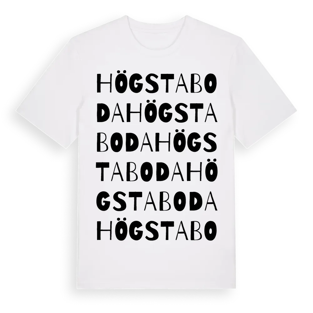 Högstaboda ordlek t-shirt är inspirerad av byn Högstaboda i Örebro län, Sverige. Tröjan är designad för dig som har en speciell koppling till platsen – oavsett om du bor här, har rötterna här eller bara älskar Högstaboda.