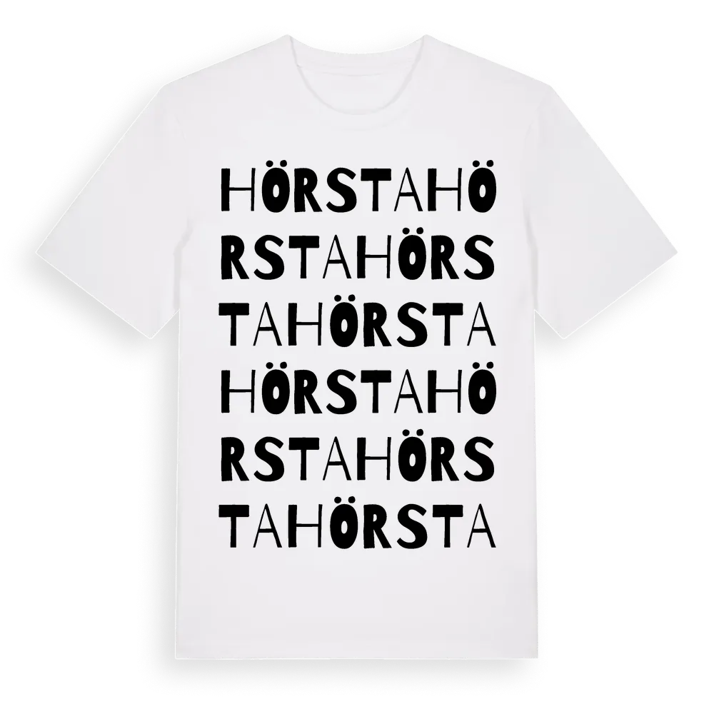 En ordlek byggd på Hörstas namn. Subtilt och klurig – ett motiv som bara de som verkligen känner platsen fullt ut förstår. Premium bomull, unisex – från byn Hörsta i Örebro län.
