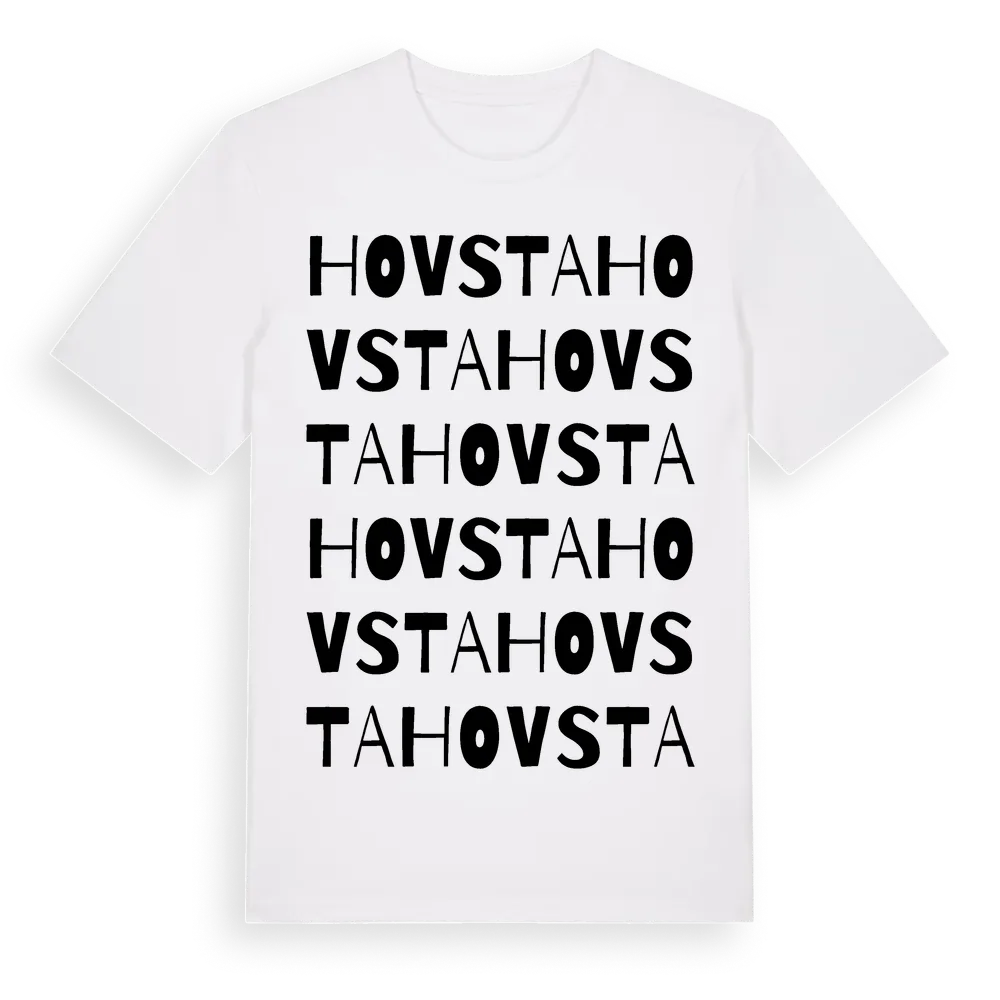 En ordlek byggd på Hovstas namn. Subtilt och klurig – ett motiv som bara de som verkligen känner platsen fullt ut förstår. Premium bomull, unisex – från byn Hovsta i Örebro län.