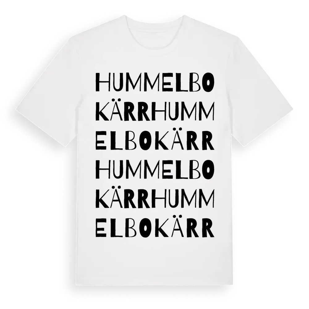 Hummelbokärr ordlek t-shirt är inspirerad av Hummelbokärr i Örebro län, Sverige. Tröjan är designad för dig som har en speciell koppling till platsen – oavsett om du bor här, har rötterna här eller bara älskar Hummelbokärr.