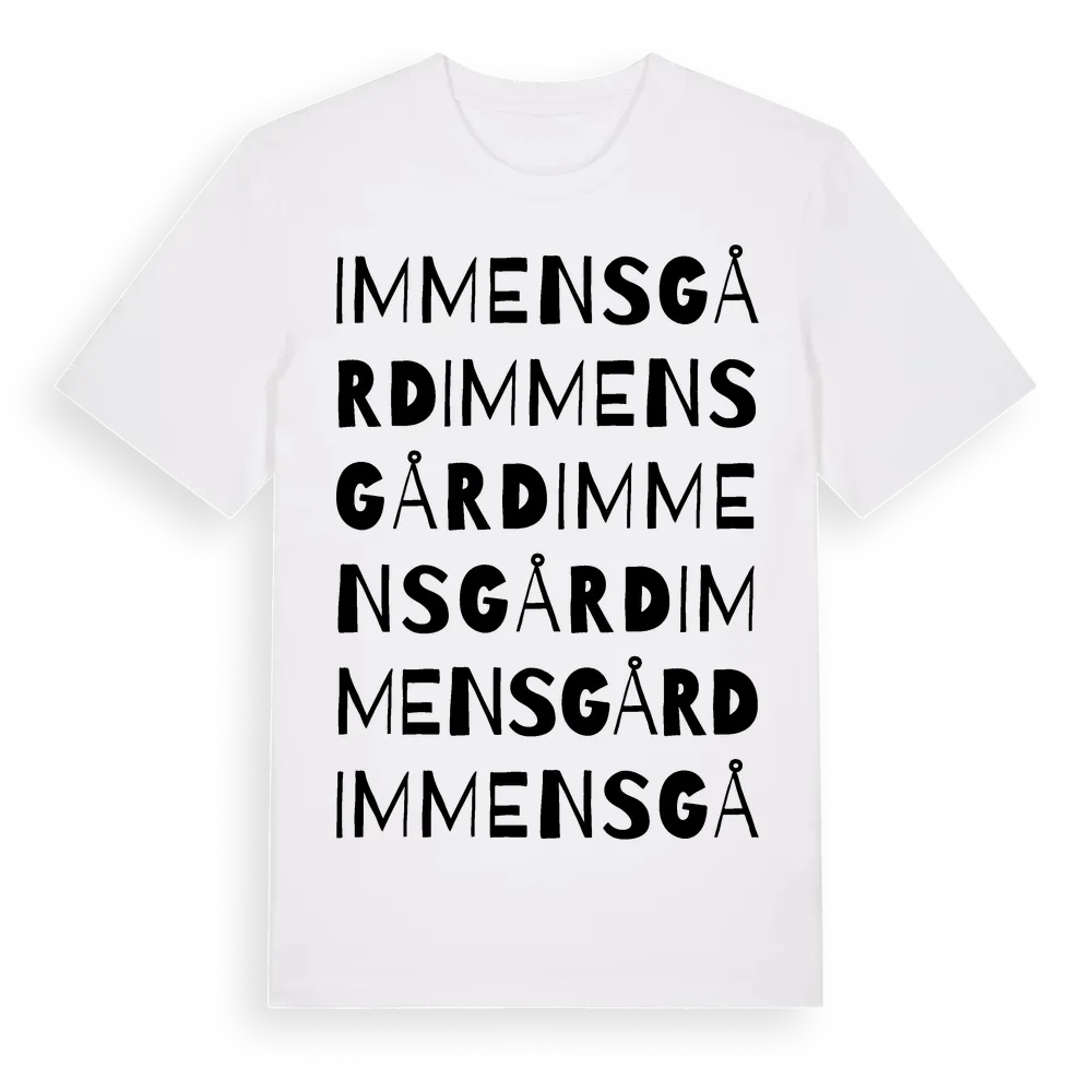 Immens Gård ordlek t-shirt är inspirerad av Immens Gård i Örebro län, Sverige. Tröjan är designad för dig som har en speciell koppling till platsen – oavsett om du bor här, har rötterna här eller bara älskar Immens Gård.