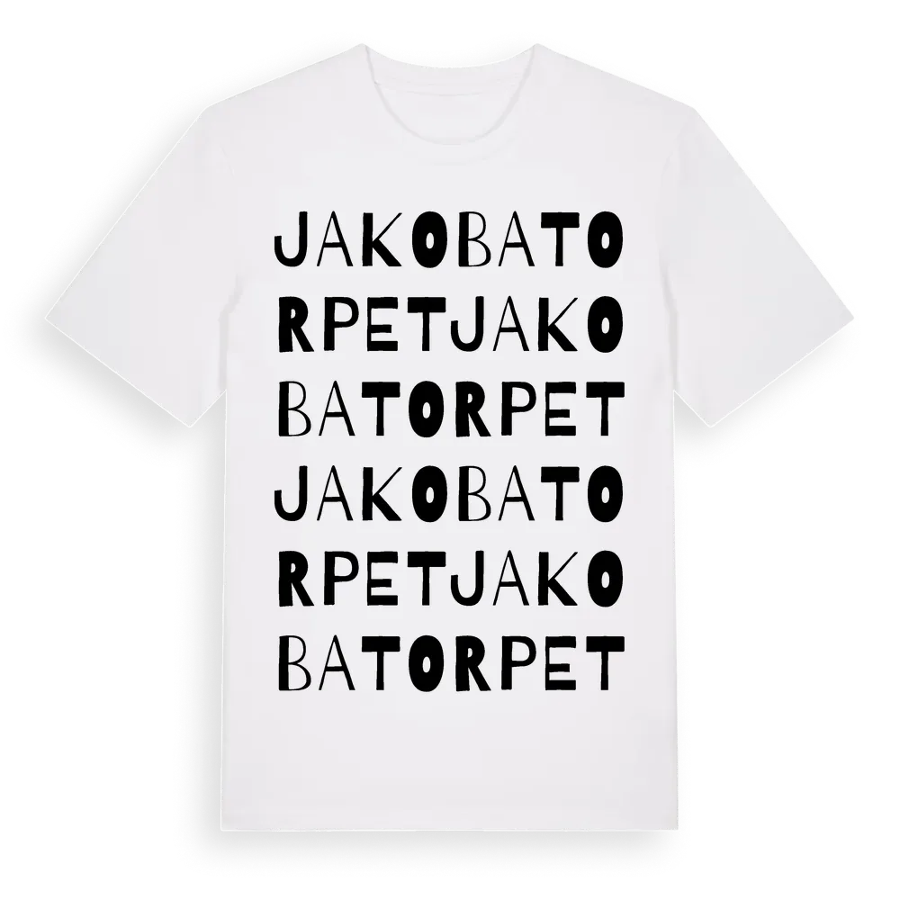 Jakobatorpet ordlek t-shirt är inspirerad av Jakobatorpet i Örebro län, Sverige. Tröjan är designad för dig som har en speciell koppling till platsen – oavsett om du bor här, har rötterna här eller bara älskar Jakobatorpet.