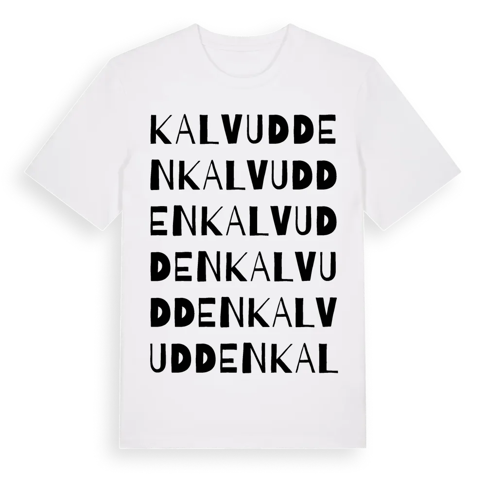 En ordlek byggd på Kalvuddens namn. Subtilt och klurig – ett motiv som bara de som verkligen känner platsen fullt ut förstår. Premium bomull, unisex – från Kalvudden i Örebro län.