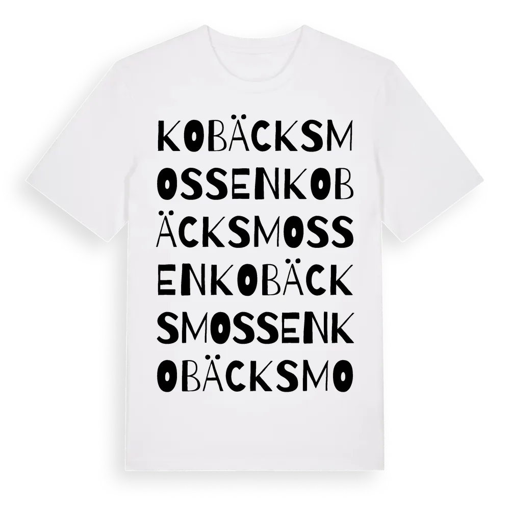 Kobäcksmossen ordlek t-shirt är inspirerad av Kobäcksmossen i Örebro län, Sverige. Tröjan är designad för dig som har en speciell koppling till platsen – oavsett om du bor här, har rötterna här eller bara älskar Kobäcksmossen.