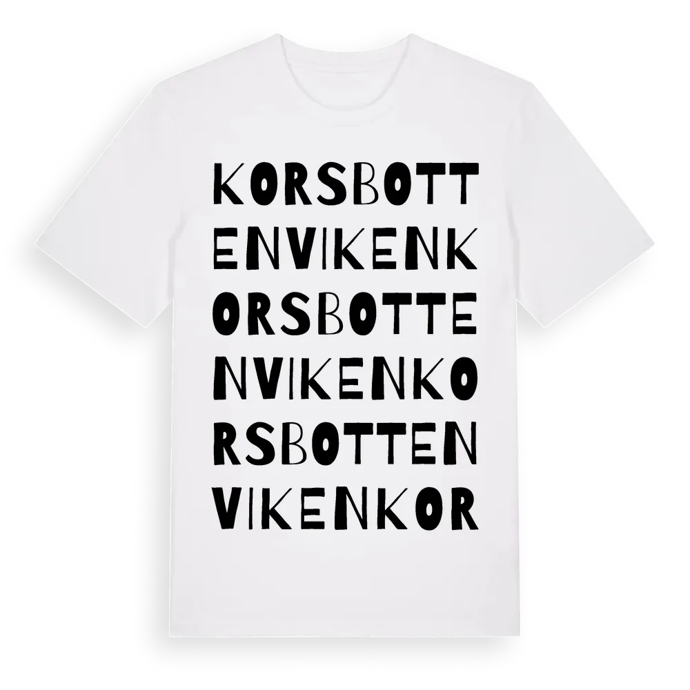 Korsbottenviken ordlek t-shirt är inspirerad av Korsbottenviken i Örebro län, Sverige. Tröjan är designad för dig som har en speciell koppling till platsen – oavsett om du bor här, har rötterna här eller bara älskar Korsbottenviken.
