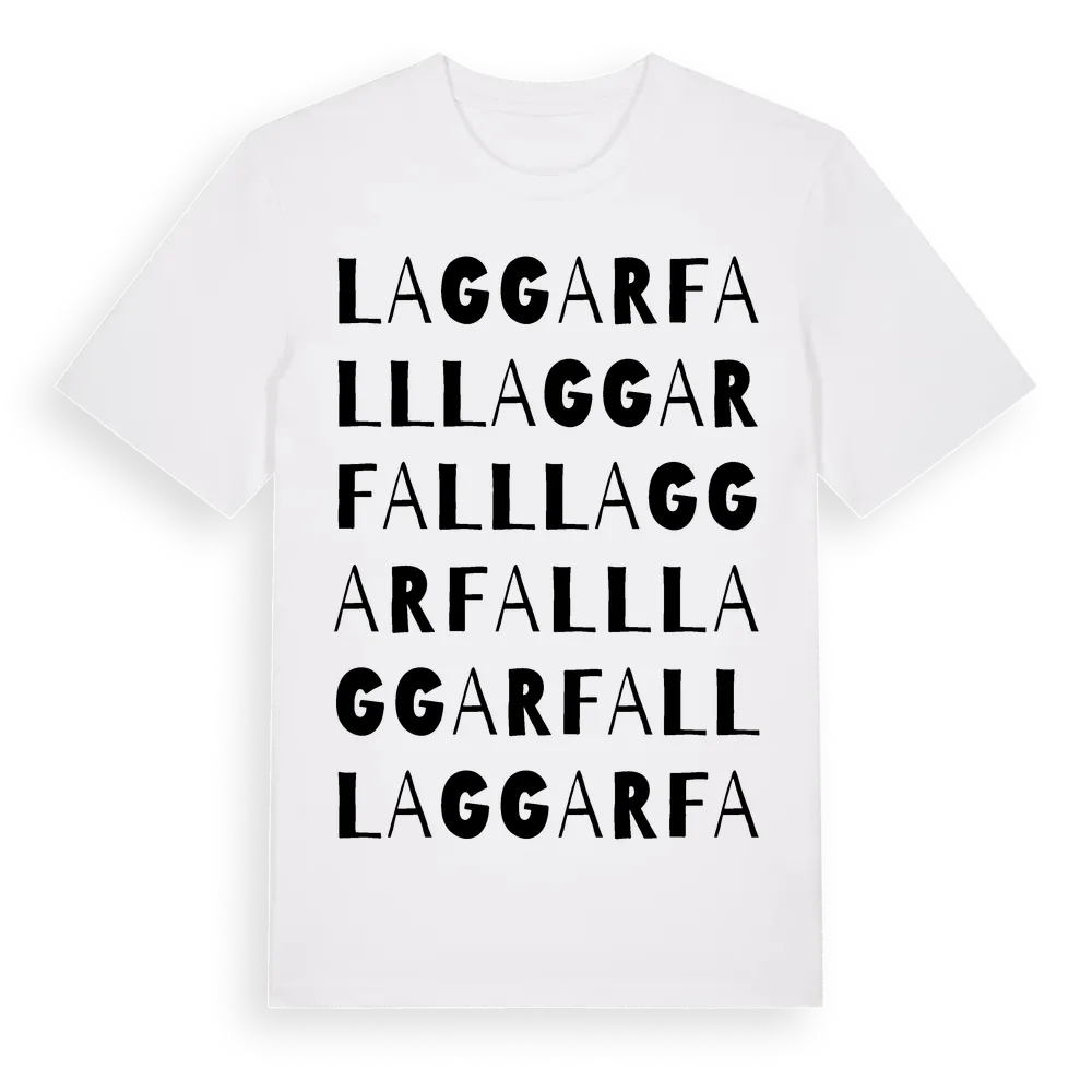 Laggarfall ordlek t-shirt är inspirerad av byn Laggarfall i Örebro län, Sverige. Tröjan är designad för dig som har en speciell koppling till platsen – oavsett om du bor här, har rötterna här eller bara älskar Laggarfall.
