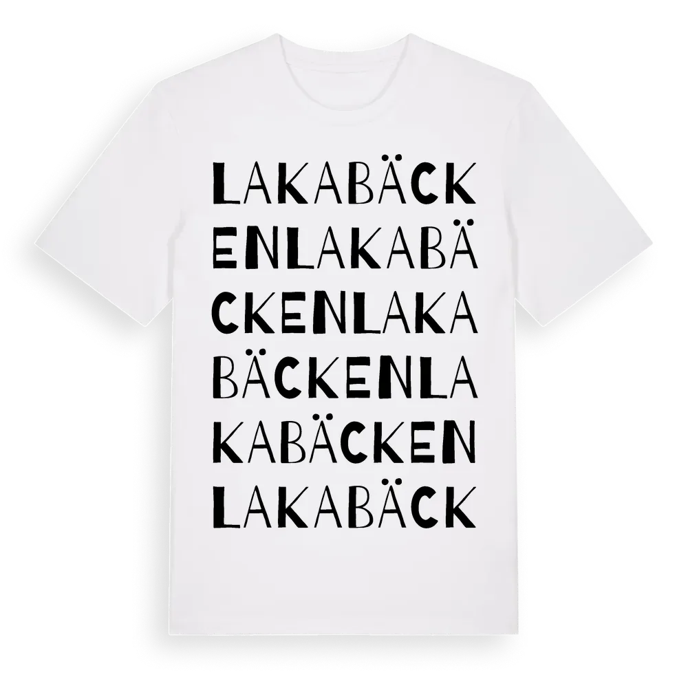 Lakabäcken ordlek t-shirt är inspirerad av byn Lakabäcken i Örebro län, Sverige. Tröjan är designad för dig som har en speciell koppling till platsen – oavsett om du bor här, har rötterna här eller bara älskar Lakabäcken.