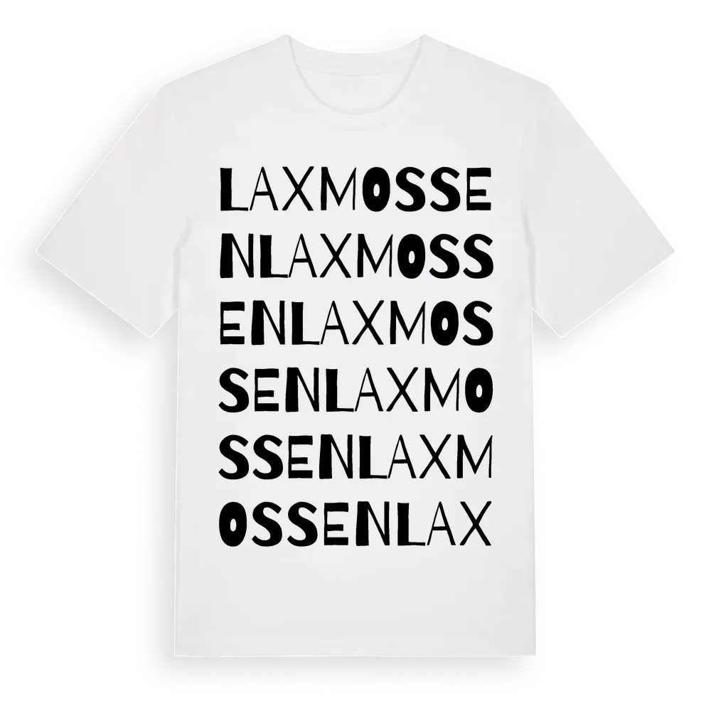 Laxmossen ordlek t-shirt är inspirerad av byn Laxmossen i Örebro län, Sverige. Tröjan är designad för dig som har en speciell koppling till platsen – oavsett om du bor här, har rötterna här eller bara älskar Laxmossen.