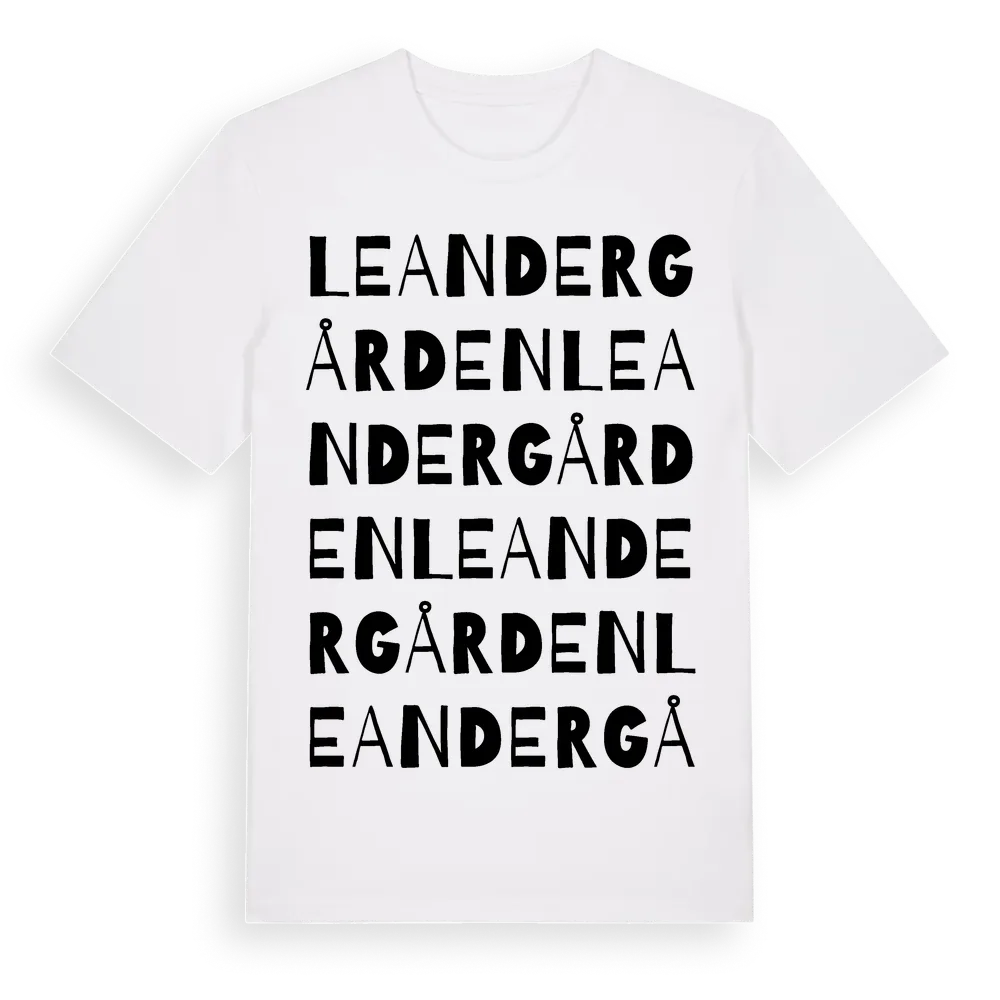Leandergården ordlek t-shirt är inspirerad av Leandergården i Örebro län, Sverige. Tröjan är designad för dig som har en speciell koppling till platsen – oavsett om du bor här, har rötterna här eller bara älskar Leandergården.