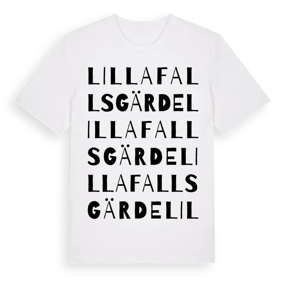 Lilla Fallsgärde ordlek t-shirt är inspirerad av Lilla Fallsgärde i Örebro län, Sverige. Tröjan är designad för dig som har en speciell koppling till platsen – oavsett om du bor här, har rötterna här eller bara älskar Lilla Fallsgärde.