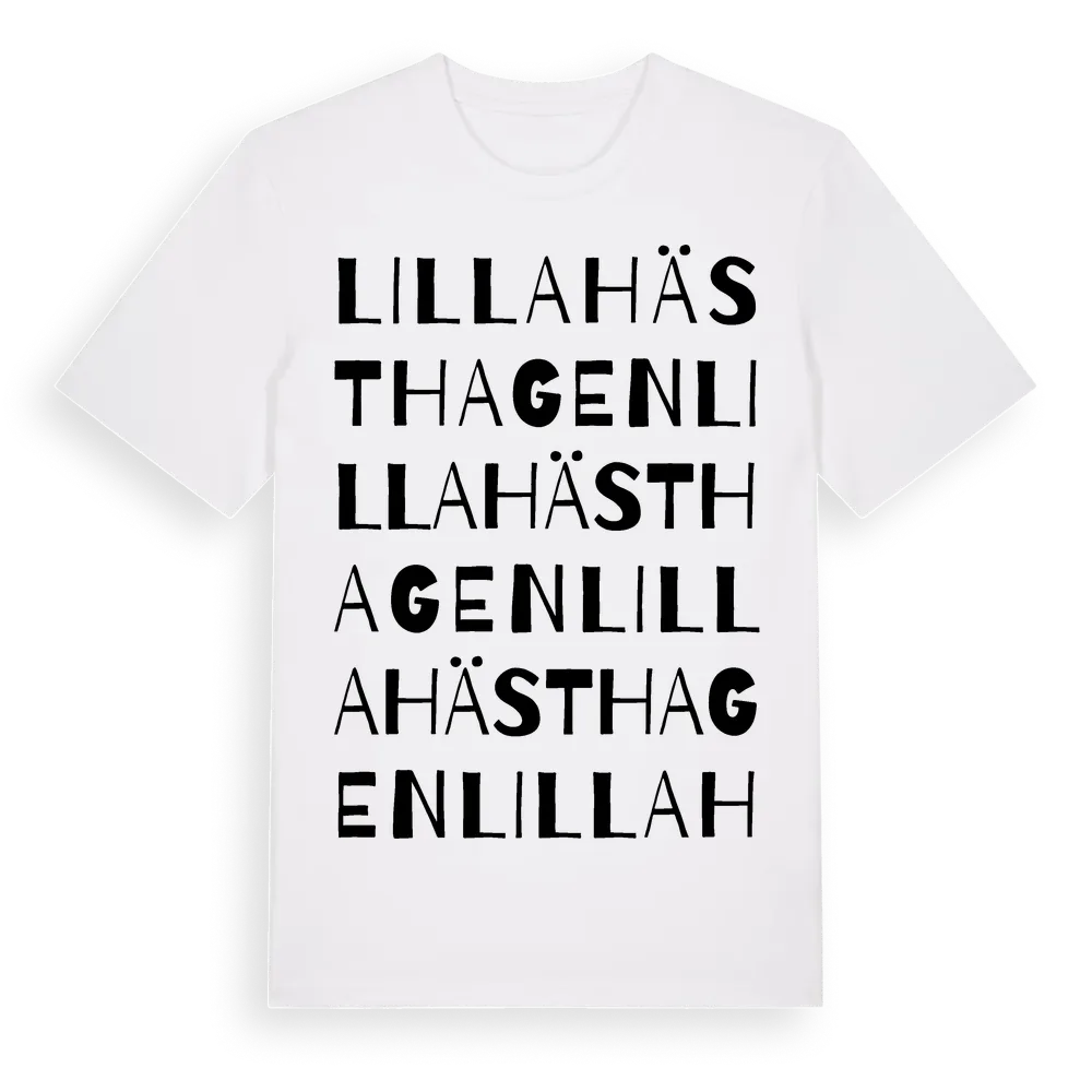 Lilla Hästhagen ordlek t-shirt är inspirerad av Lilla Hästhagen i Örebro län, Sverige. Tröjan är designad för dig som har en speciell koppling till platsen – oavsett om du bor här, har rötterna här eller bara älskar Lilla Hästhagen.