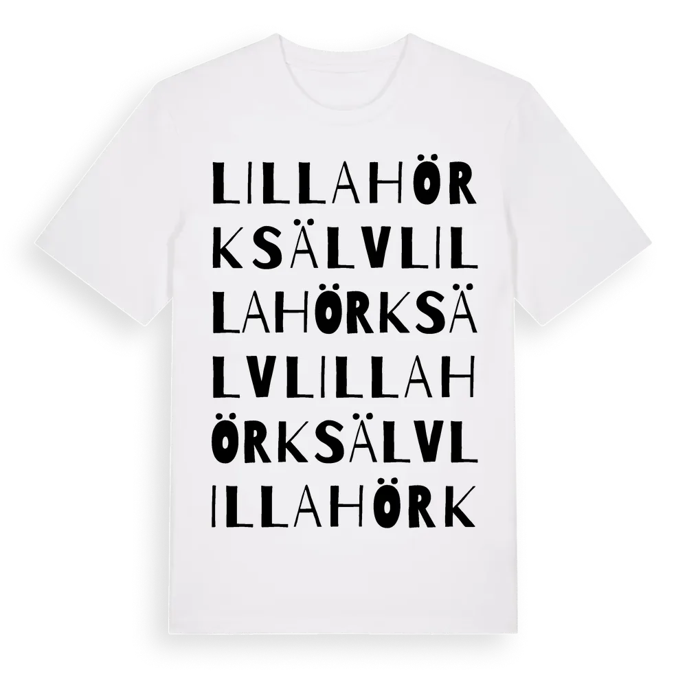Lilla Hörksälv ordlek t-shirt är inspirerad av Lilla Hörksälv i Örebro län, Sverige. Tröjan är designad för dig som har en speciell koppling till platsen – oavsett om du bor här, har rötterna här eller bara älskar Lilla Hörksälv.