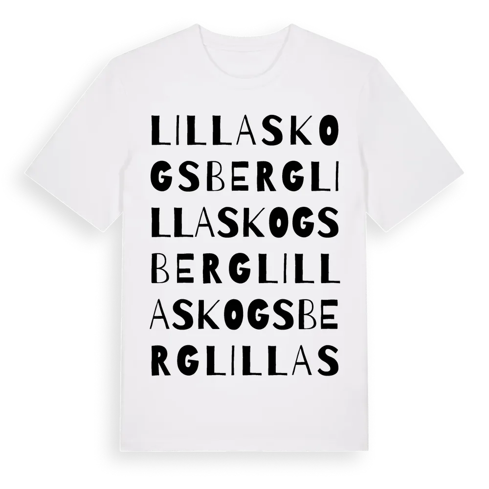 Lilla Skogsberg ordlek t-shirt är inspirerad av Lilla Skogsberg i Örebro län, Sverige. Tröjan är designad för dig som har en speciell koppling till platsen – oavsett om du bor här, har rötterna här eller bara älskar Lilla Skogsberg.