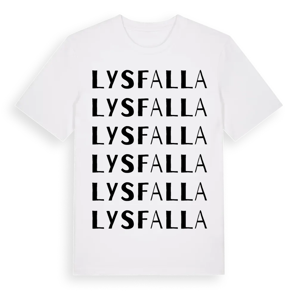Lysfalla ordlek t-shirt är inspirerad av byn Lysfalla i Örebro län, Sverige. Tröjan är designad för dig som har en speciell koppling till platsen – oavsett om du bor här, har rötterna här eller bara älskar Lysfalla.