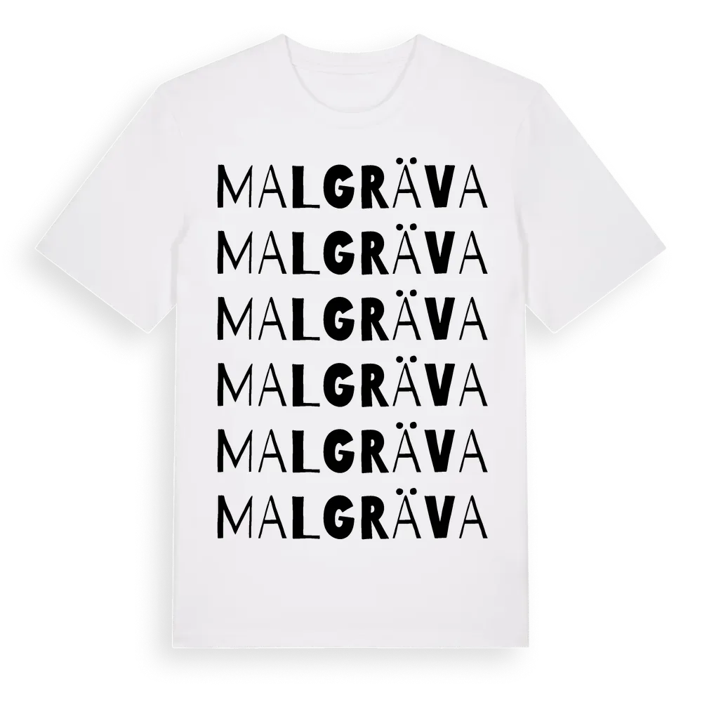 Malgräva ordlek t-shirt är inspirerad av Malgräva i Örebro län, Sverige. Tröjan är designad för dig som har en speciell koppling till platsen – oavsett om du bor här, har rötterna här eller bara älskar Malgräva.