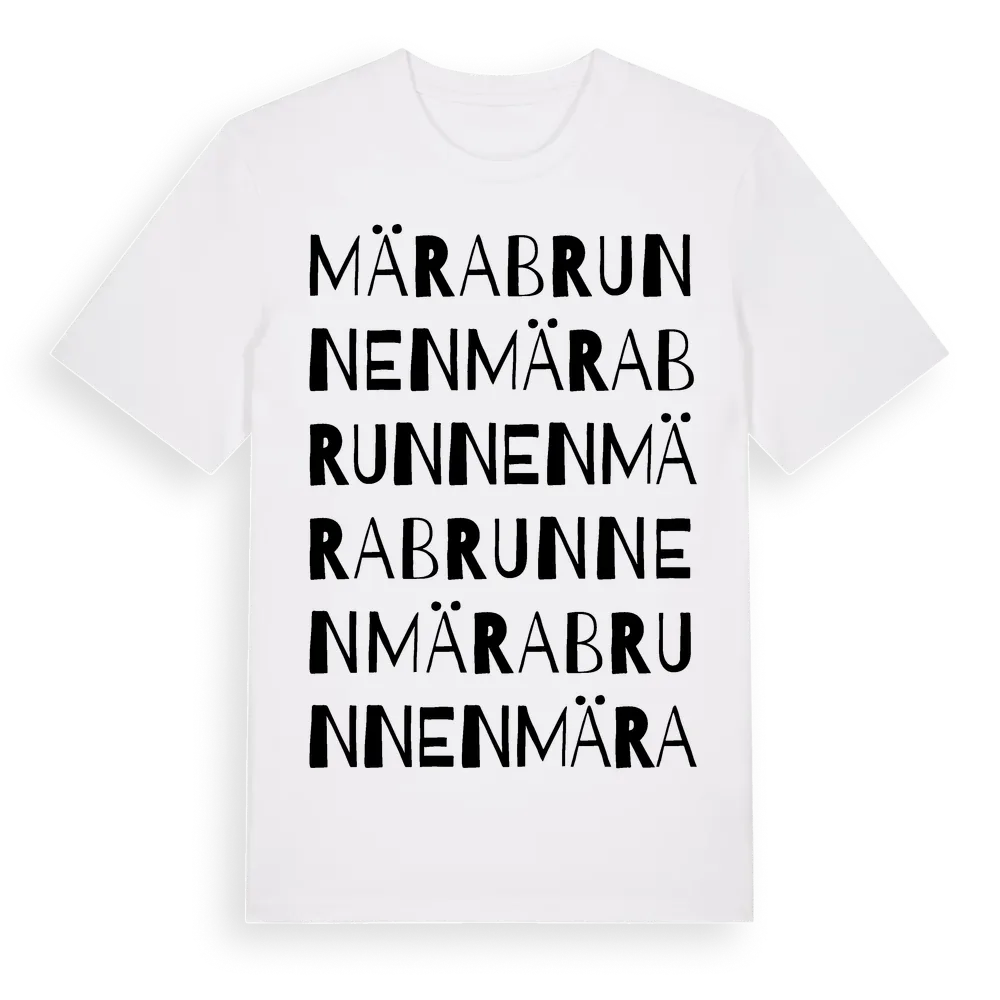Märabrunnen ordlek t-shirt är inspirerad av Märabrunnen i Örebro län, Sverige. Tröjan är designad för dig som har en speciell koppling till platsen – oavsett om du bor här, har rötterna här eller bara älskar Märabrunnen.