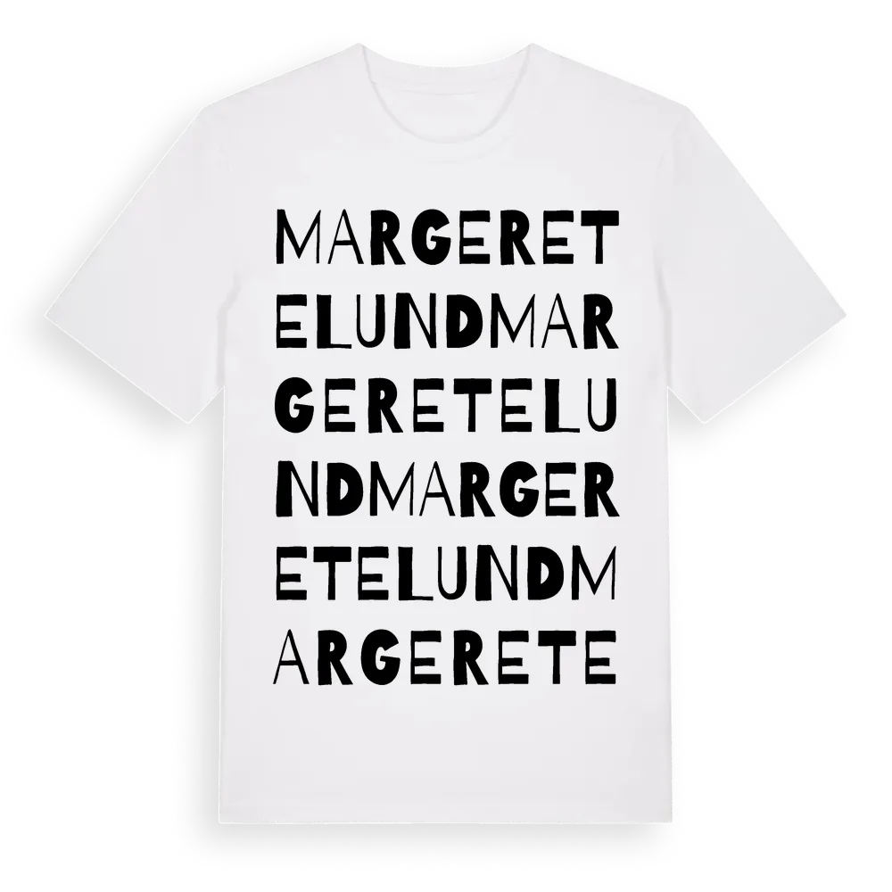 Margeretelund ordlek t-shirt är inspirerad av Margeretelund i Örebro län, Sverige. Tröjan är designad för dig som har en speciell koppling till platsen – oavsett om du bor här, har rötterna här eller bara älskar Margeretelund.