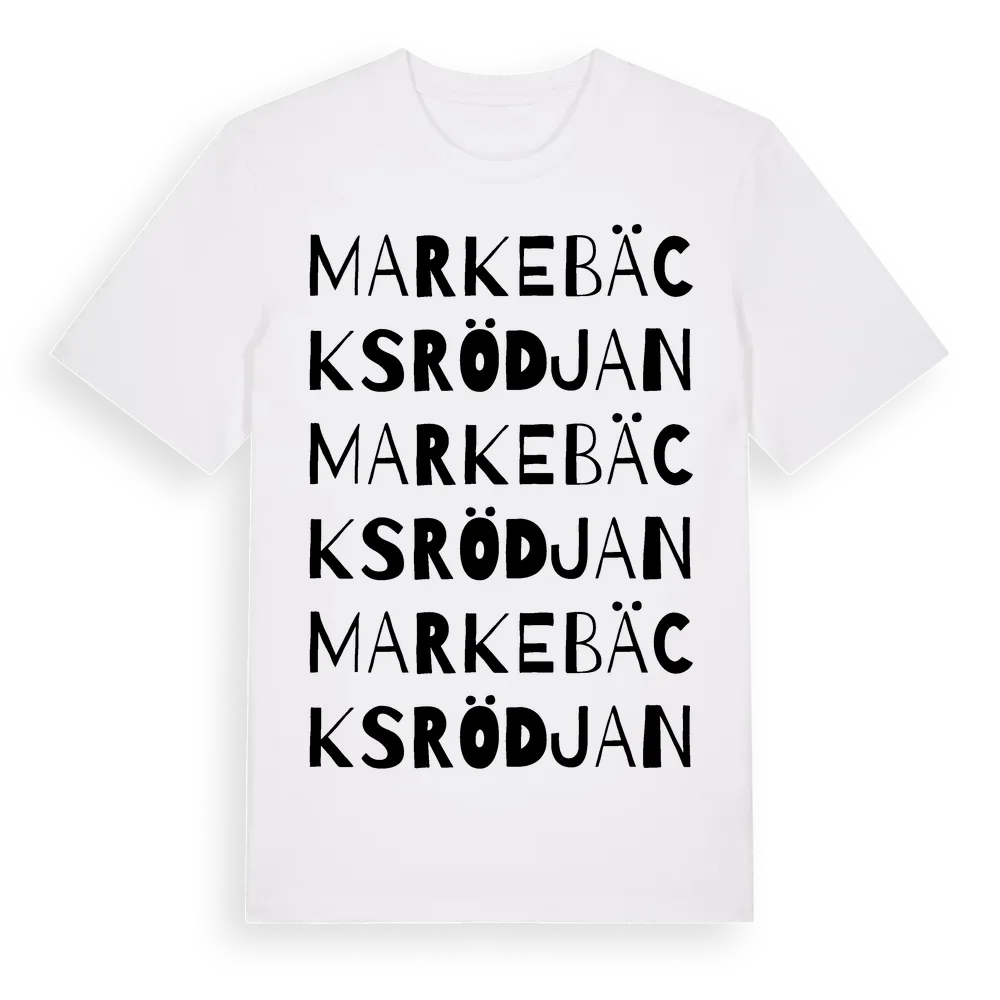 Markebäcksrödjan ordlek t-shirt är inspirerad av Markebäcksrödjan i Örebro län, Sverige. Tröjan är designad för dig som har en speciell koppling till platsen – oavsett om du bor här, har rötterna här eller bara älskar Markebäcksrödjan.