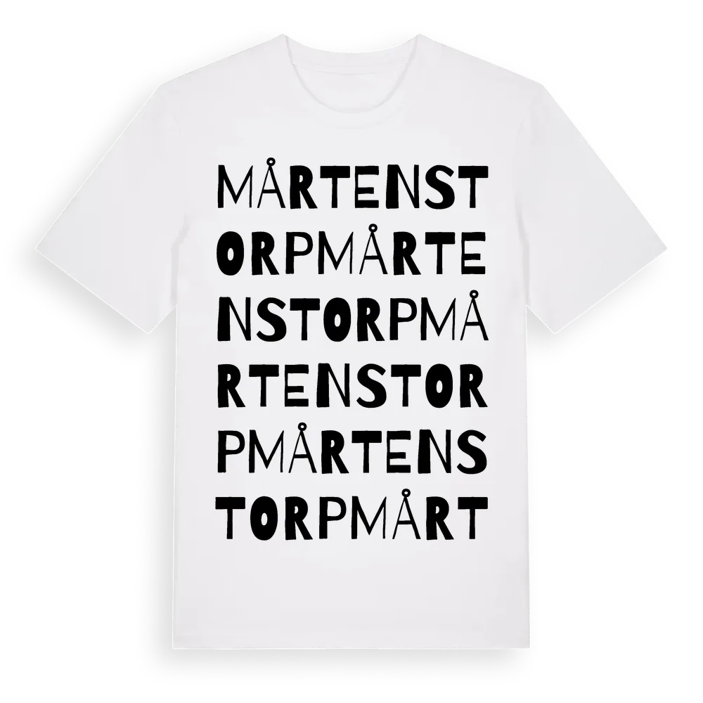 Mårtenstorp ordlek t-shirt är inspirerad av byn Mårtenstorp i Örebro län, Sverige. Tröjan är designad för dig som har en speciell koppling till platsen – oavsett om du bor här, har rötterna här eller bara älskar Mårtenstorp.