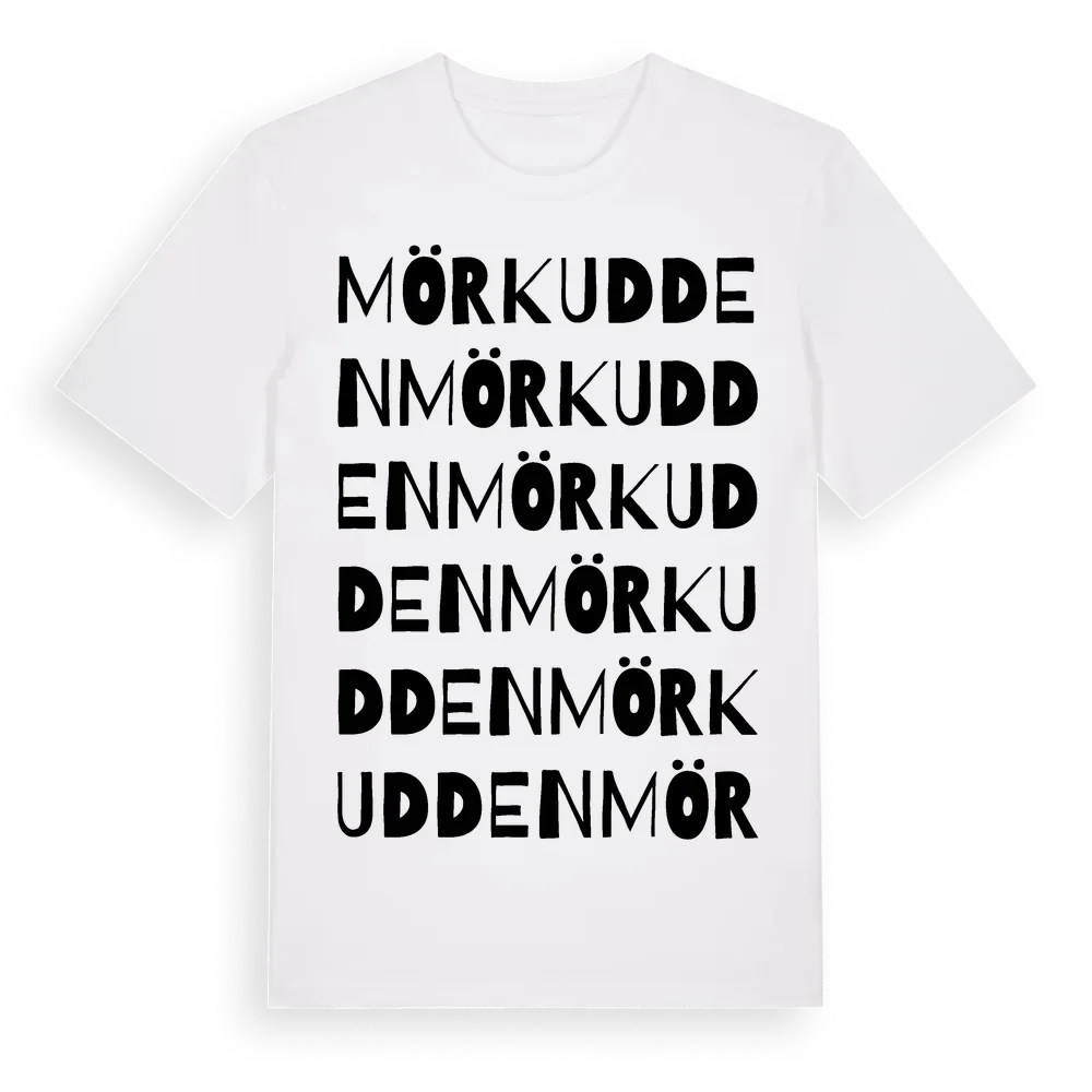 Mörkudden ordlek t-shirt är inspirerad av Mörkudden i Örebro län, Sverige. Tröjan är designad för dig som har en speciell koppling till platsen – oavsett om du bor här, har rötterna här eller bara älskar Mörkudden.