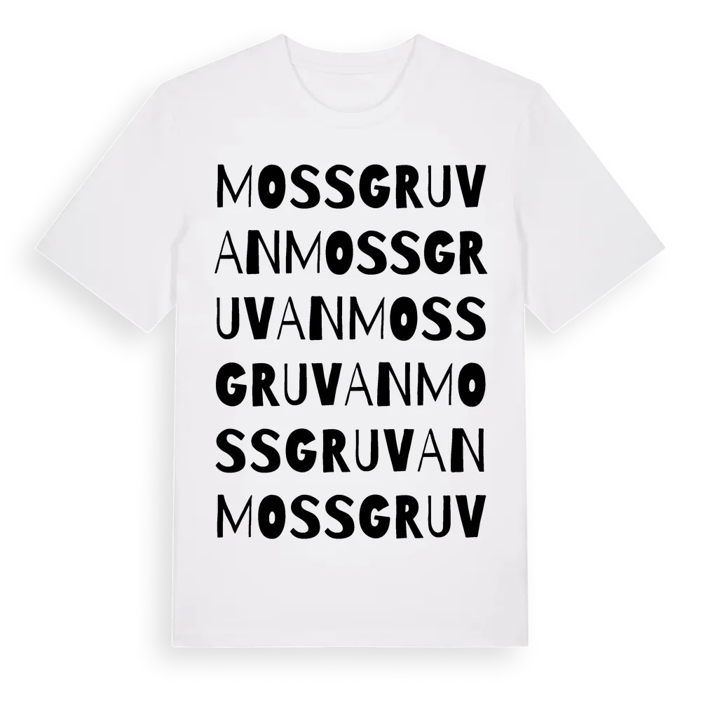Mossgruvan ordlek t-shirt är inspirerad av byn Mossgruvan i Örebro län, Sverige. Tröjan är designad för dig som har en speciell koppling till platsen – oavsett om du bor här, har rötterna här eller bara älskar Mossgruvan.