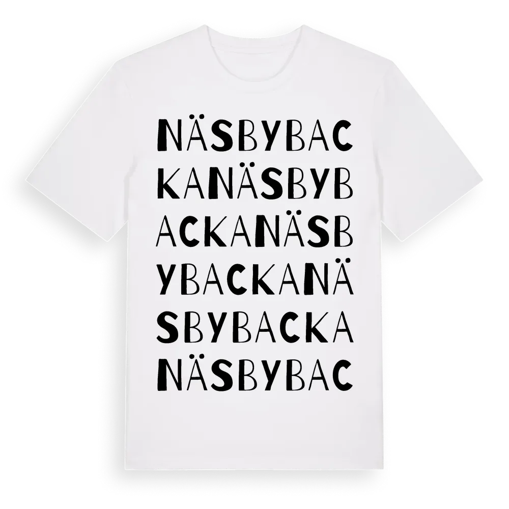 Näsbybacka ordlek t-shirt är inspirerad av byn Näsbybacka i Örebro län, Sverige. Tröjan är designad för dig som har en speciell koppling till platsen – oavsett om du bor här, har rötterna här eller bara älskar Näsbybacka.