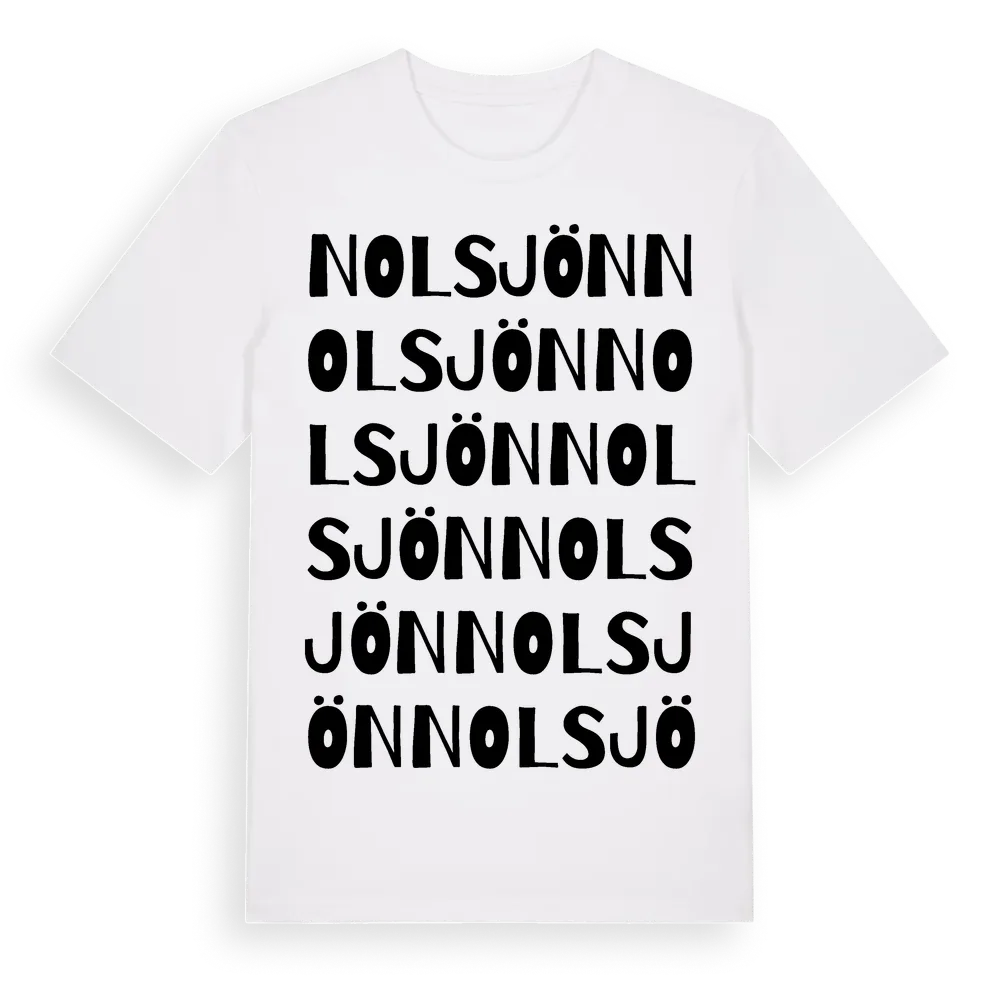 Nolsjön ordlek t-shirt är inspirerad av byn Nolsjön i Örebro län, Sverige. Tröjan är designad för dig som har en speciell koppling till platsen – oavsett om du bor här, har rötterna här eller bara älskar Nolsjön.