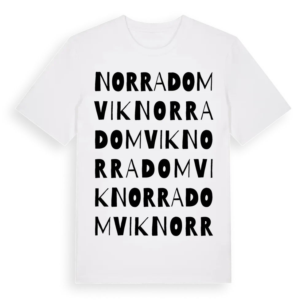 Norra Domvik ordlek t-shirt är inspirerad av Norra Domvik i Örebro län, Sverige. Tröjan är designad för dig som har en speciell koppling till platsen – oavsett om du bor här, har rötterna här eller bara älskar Norra Domvik.